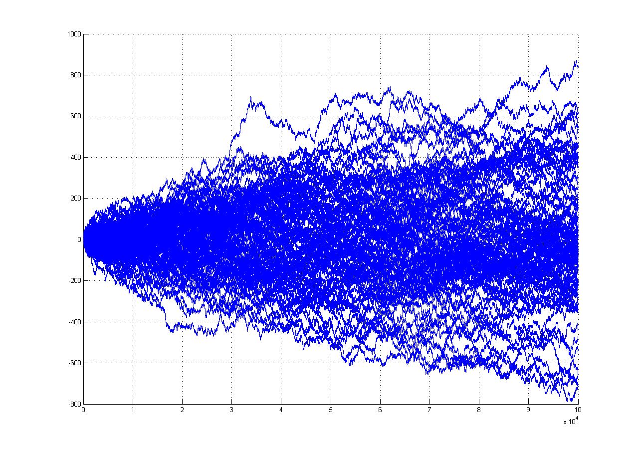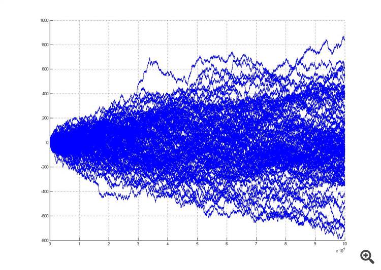 Вот картинка, когда-то давно генерил. Всего 100 траекторий случайного блуждания по 100 тысяч шагов в каждой. Даже на этой картинке со всего-то ста траекториями видно что пространство возможных состояний заполняется очень равномерно. А если бы траекторий было 10 000 или 100 000?