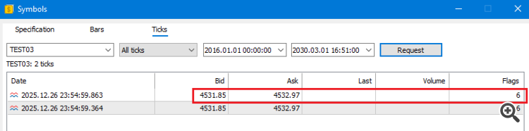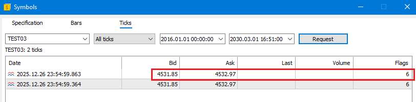 Если значение полей ticks[k].bid, ticks[k].ask, ticks[k].last или ticks[k].volume больше нуля, то в поле ticks[k].flags пишется комбинация соответствующих флагов: