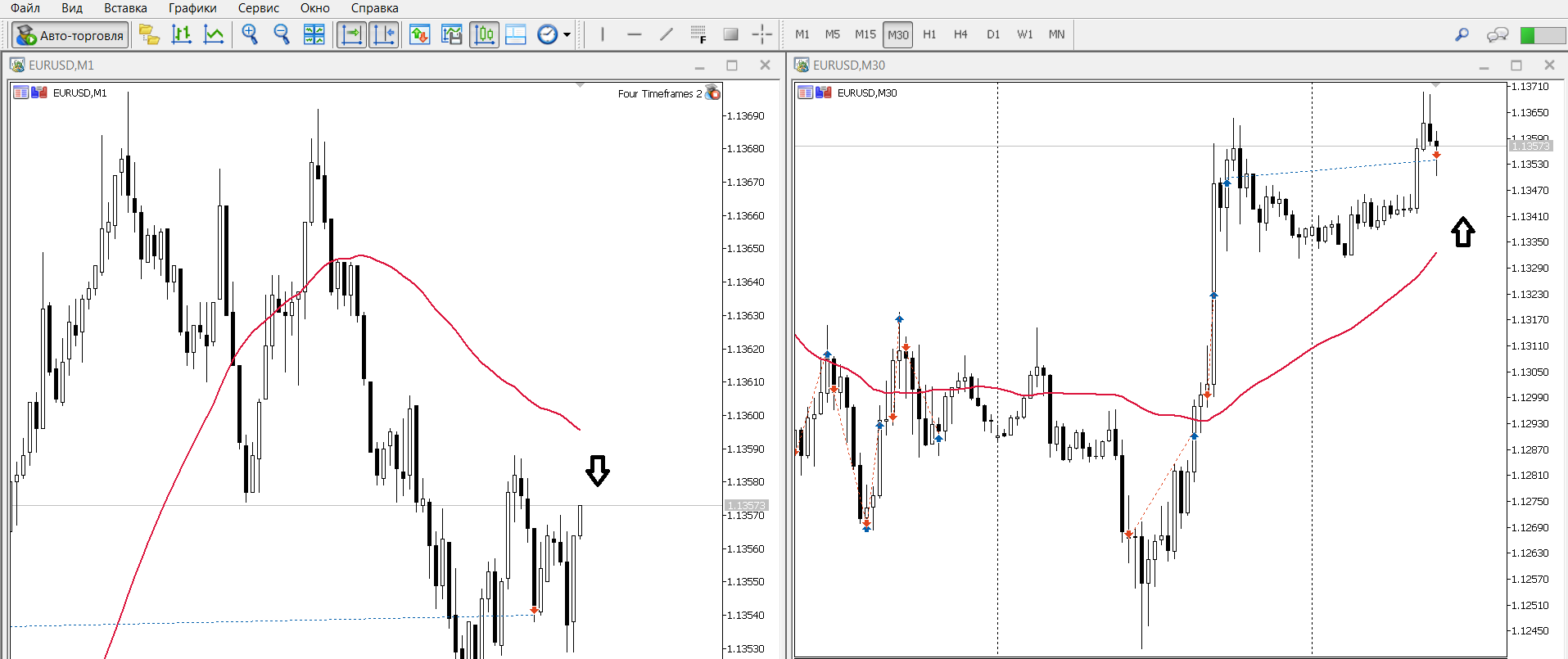 Здравствуйте Владимир потестила ваш эксперт получилось на паре EURJPY работает с моими настройками не плохо но есть одна проблемка на скриншоте показала стрелками,когда цена идёт в разное направление он открывает ордер и получает стоп лос. Здесь явно не хватает ещё одной средней на младший таймфрейм,добавте пожалуйста-очень хочется добиться хороших результатов от эксперта...