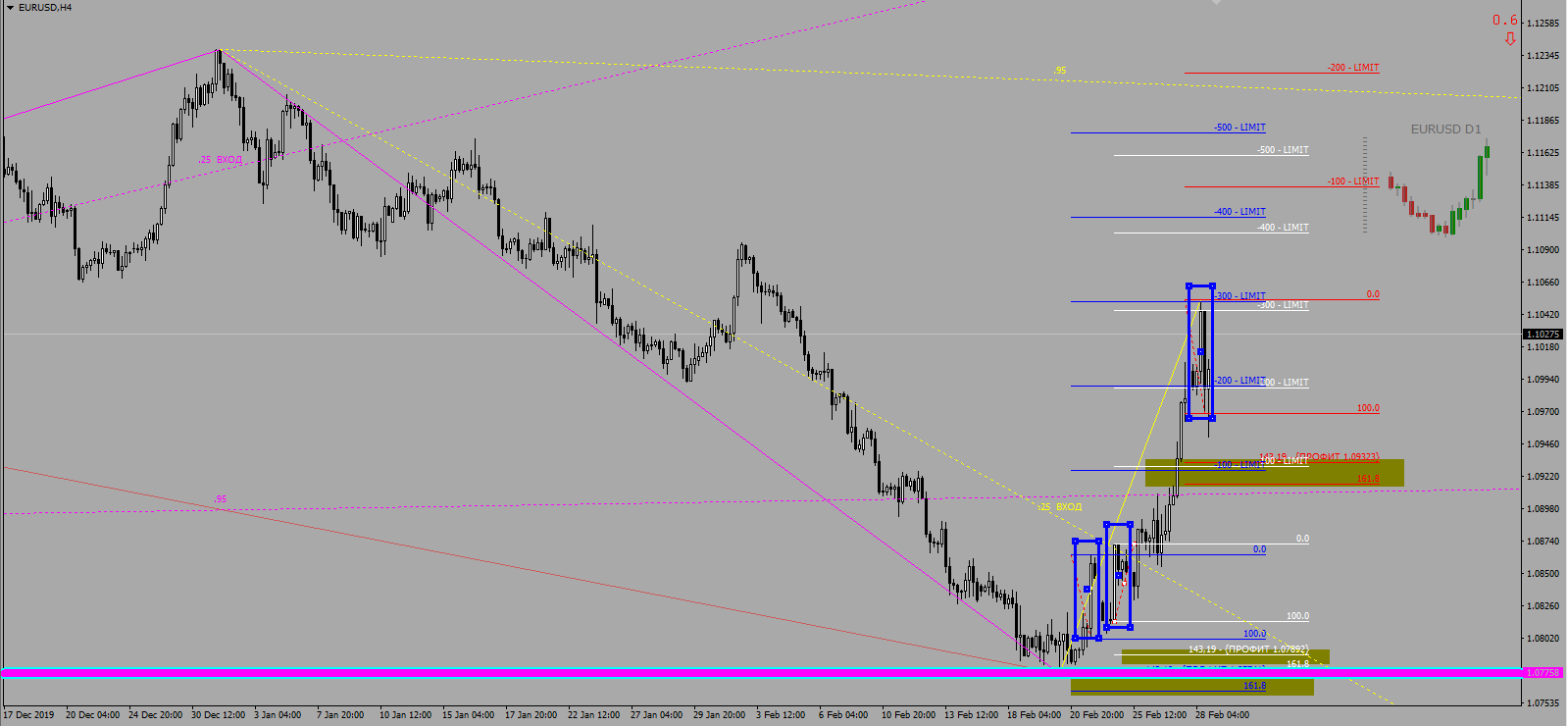 Таким образом, имеем ближайший селл сигнал на Н4 с ТР 1.94767. Естественно, сразу цель не дают, нужно ждать входа на Н1.