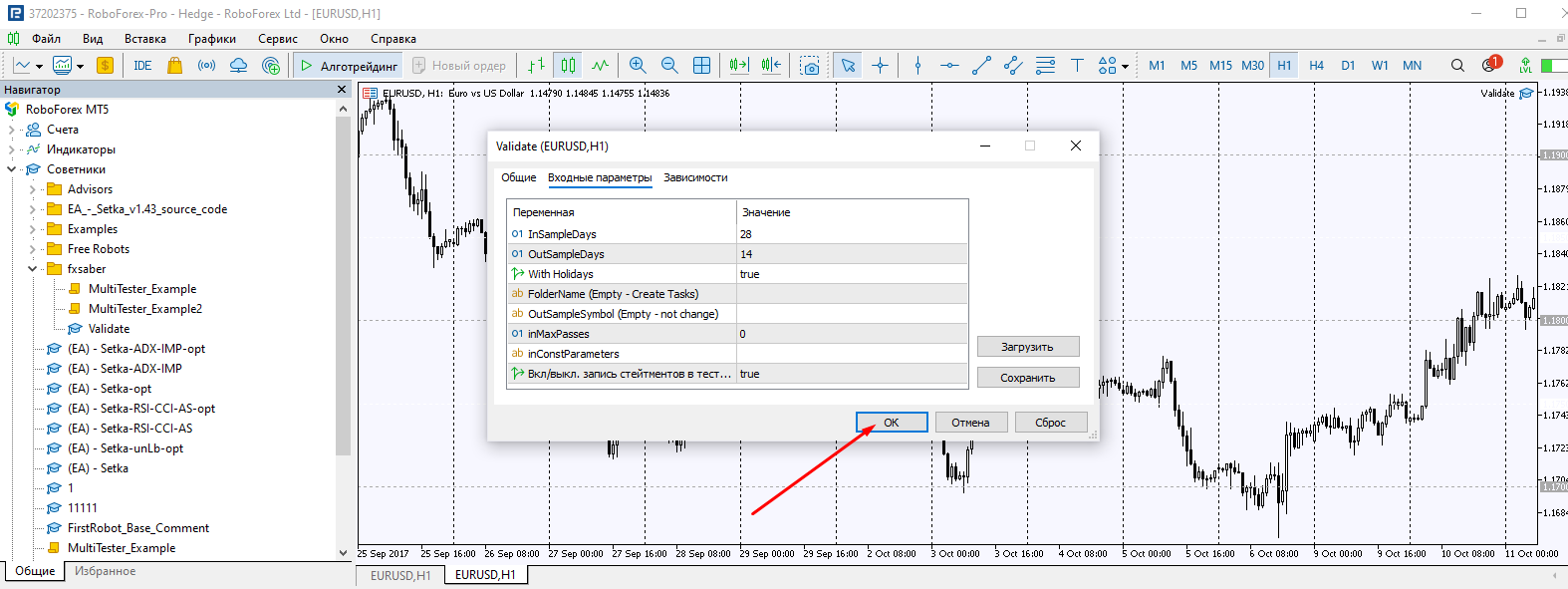 Хочу получить walk-forward режим. Запускаю для пробы в стоковом режиме, ничего не меняю.