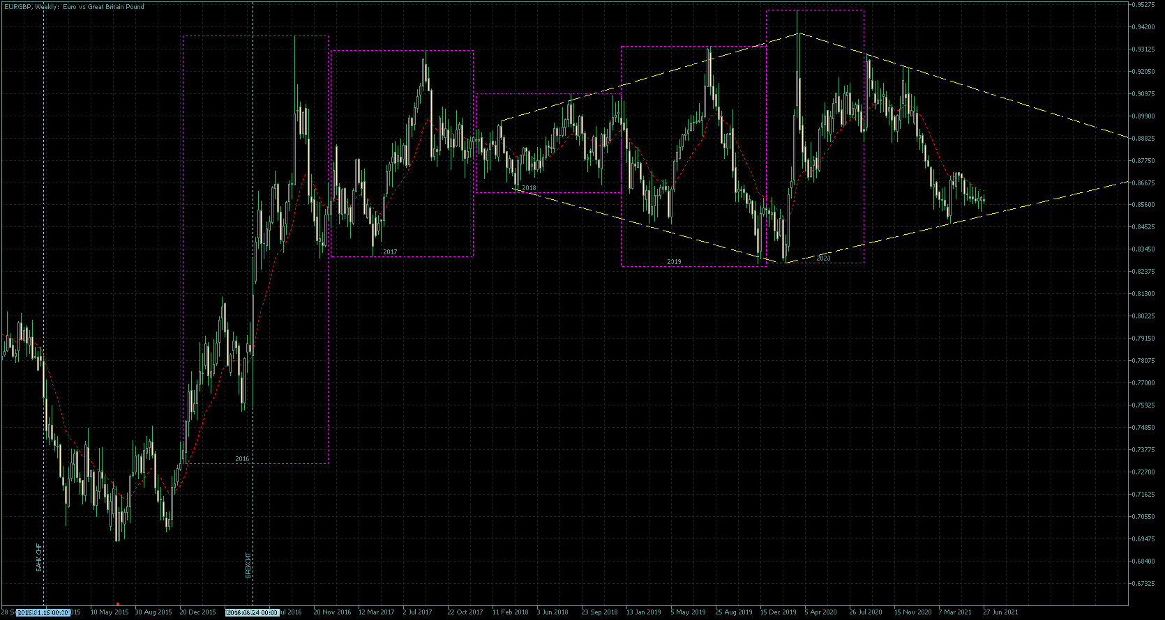 Пара торгуется в области 8600 -уровня , weekly - с 2018 г. формировалась "расширяющаяся" структура , с 2020 сужающая тенденция , если торговля будет выше 8700 - уровня , то вероятно формируется " алмазная" структура по ТА с потенциалом движения по ТА. Балансовый уровень - 8580 , S\R - 8620 и 8545 .