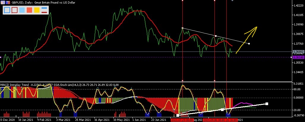 GBP\USD-H2 предположительно что цена упадёт к этому уровню 1.36092 по индикатору Pivot . Но так же есть другой индикатор "Coral" который ещё поддерживает движение верх