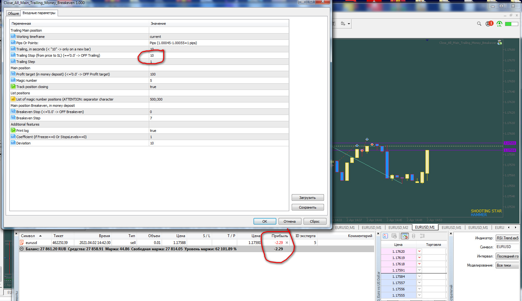 я ему выставил трелинг стоп 30 руб и трелинг степ 5 руб цена дошла до 90 рублей и вернулась на 40 рублей позиция не закрылась! Затем я выставил трелинг стоп 10 рублей и трелинг степ 1 рубль (для быстрой проверки) цена дошла до 20 рублей и вернулась в минус -1.5 руб. (вам выслал скрин этой сделки) но позиция снова не закрылась (безубыток я специально не активировал) .Добрый день! как вы сказали - настройку 'Pips Or Points:- поменял проблема та же Трелинг стоп- степ не работает. всё на сринах, лог прилагаю.