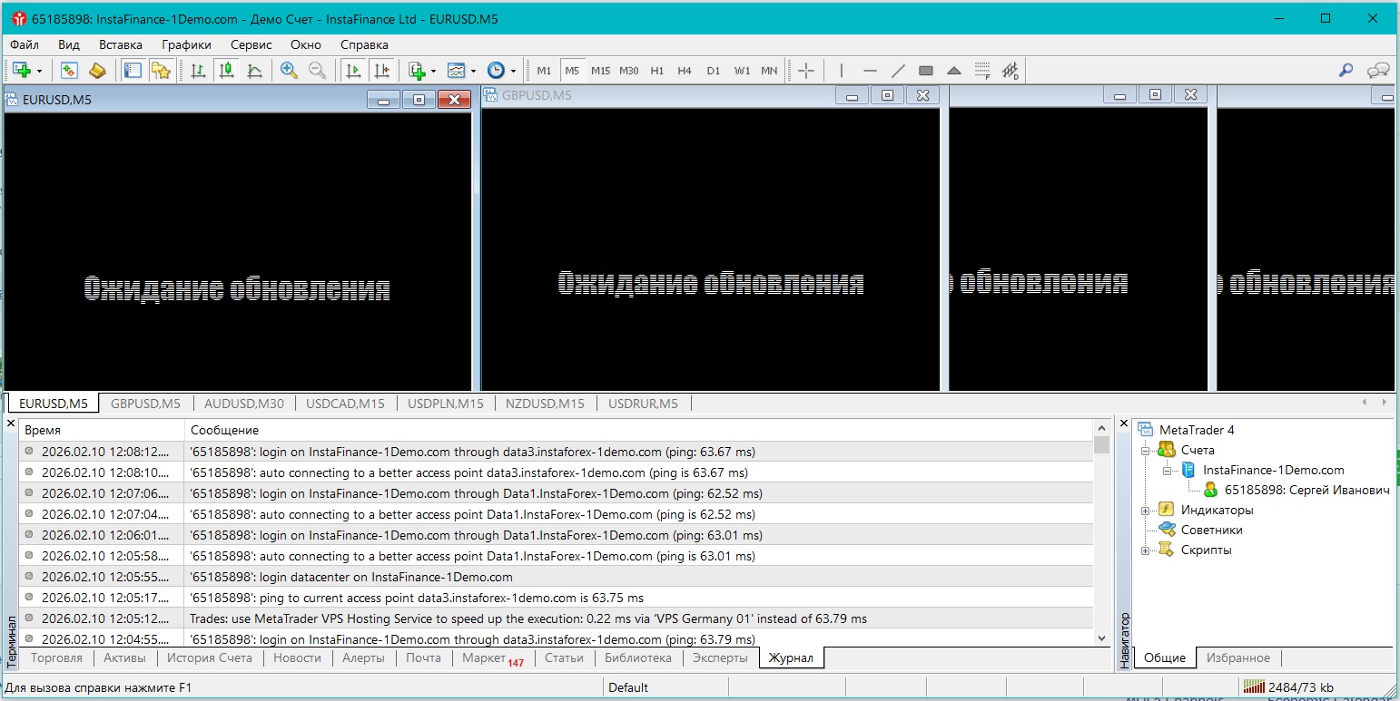 А сейчас, можете остаться на InstaFinance демо счете, но закройте графики и откройте графики снова. Если подключение к этому демо счету не удается - то откройте новый счет (см пост #1454) или обратитесь к брокеру (потому что бывает так, что брокер меняет название сервера для подключения).