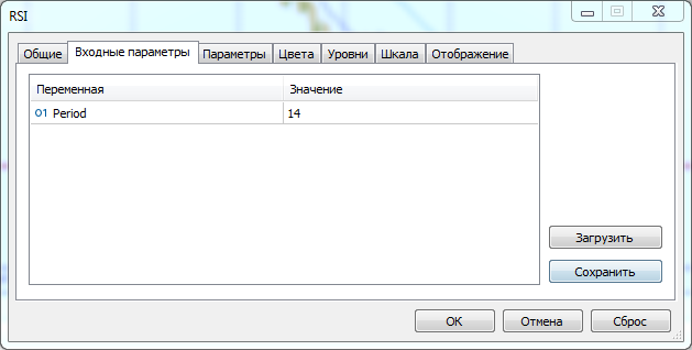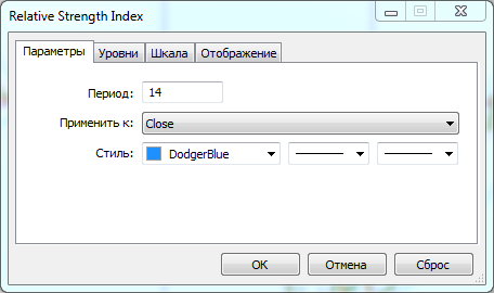 Окно параметров стандартного RSI выглядет так