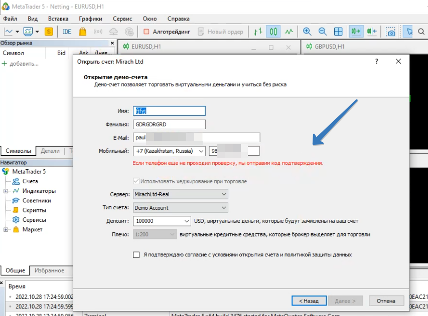 Еще, если срочно, регю новый счет демо в телефоне, и в почте смотрю логин и пароль счета.