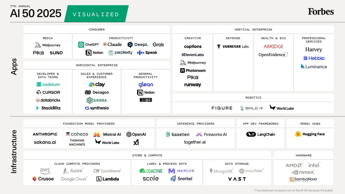 Новички списка включают Anysphere (Cursor), которая помогает инженерам писать код, приложение Speak для изучения языков и платформу OpenEvidence для врачей. Лидеры отрасли, такие как OpenAI и Anthropic, привлекли значительные инвестиции (81 млрд долларов из 142,45 млрд долларов, собранных компаниями из списка). Однако конкуренция усиливается благодаря появлению новых игроков, таких как xAI Илона Маска и Thinking Machine Labs бывшего CTO OpenAI Миры Мурати.