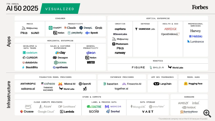 В апреле 2025 года искусственный интеллект продолжает оставаться ключевым трендом в технологическом и деловом мире. Седьмой ежегодный список Forbes AI 50, составленный в партнёрстве с Sequoia и Meritech Capital, демонстрирует растущий фокус стартапов на создании практических приложений и продуктов на основе существующих моделей ИИ для автоматизации рутинных задач в таких областях, как инженерия, здравоохранение и юриспруденция.
