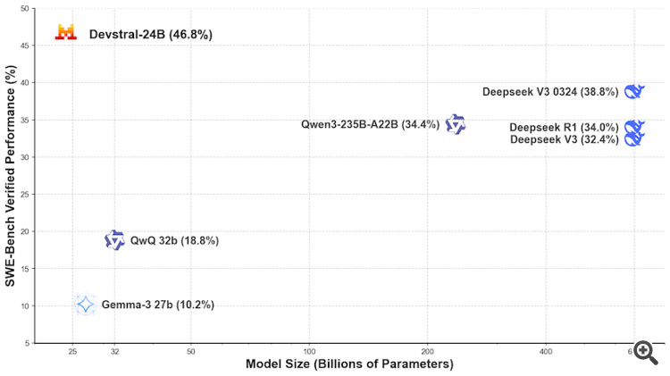 Devstral преуспевает в использовании инструментов для изучения кодовых баз, редактирования нескольких файлов и обеспечения работы агентов разработки программного обеспечения.
