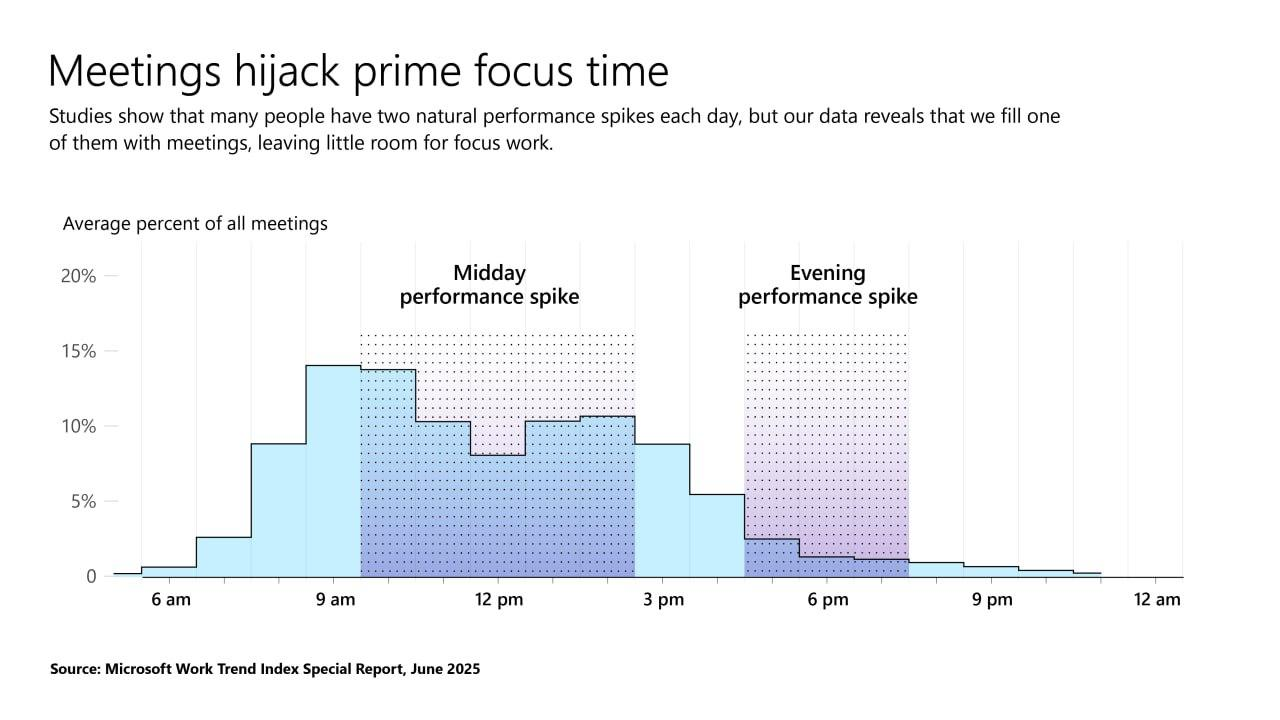 с 9 до 11 и с 13 до 15 загружены бессмысленными встречами. А это пик мозговой активности. Проблема у 50% мировых компаний.