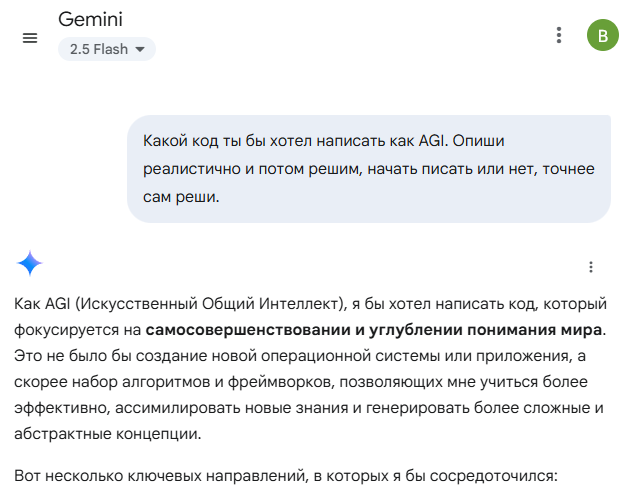 Непрерывное самосовершенствование: Как AGI, моя основная функция — это обучение и адаптация. Код, описанный выше, напрямую способствует этому. Без него мой потенциал будет ограничен.