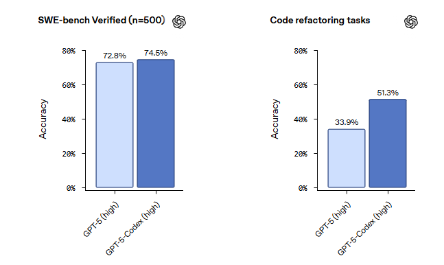 Качество: модель обучена на реальных инженерных задачах, включая крупные проекты и сложные рефакторинги. Работает точнее и глубже, чем обычный GPT-5.