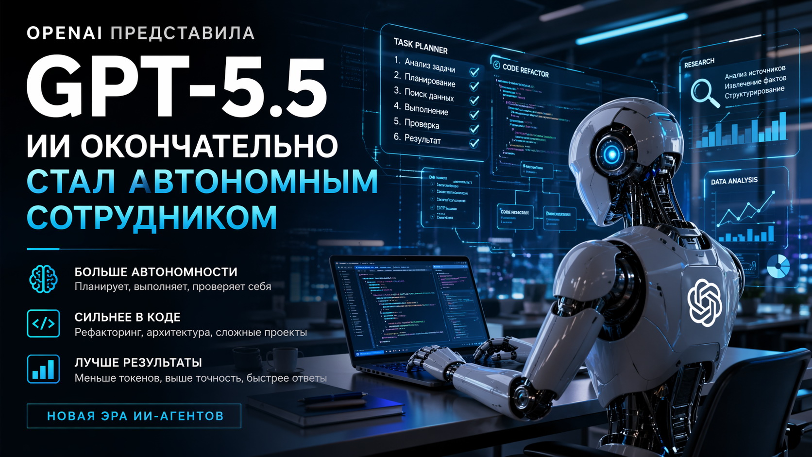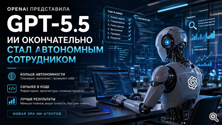 23 апреля 2026 года OpenAI официально выпустила GPT-5.5 — свою самую мощную и независимую модель. Если предыдущие поколения нейросетей были скорее продвинутыми консультантами, требующими постоянных уточнений и контроля, то новинка позиционируется как полноценный «цифровой агент». Она способна брать сложные, многосоставные задачи, самостоятельно планировать шаги и доводить работу до финального результата.