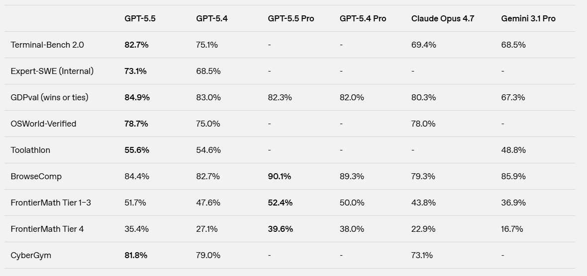 Expert-SWE: На одном из самых сложных внутренних тестов по программированию, где задачи рассчитаны на 20 часов работы Senior-разработчика, GPT-5.5 показала результат в 73,1% успешных решений (рекордный показатель на рынке).