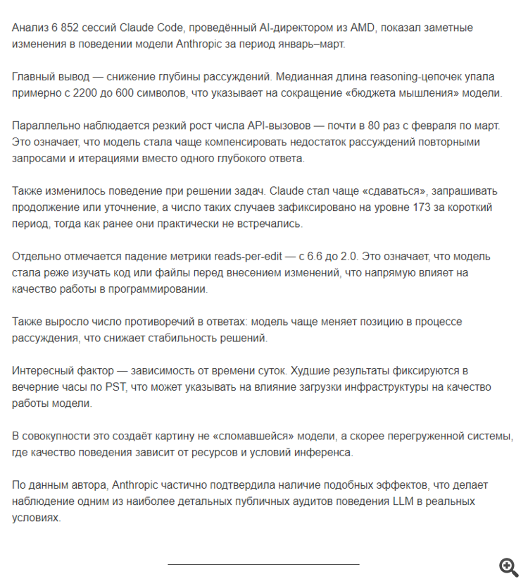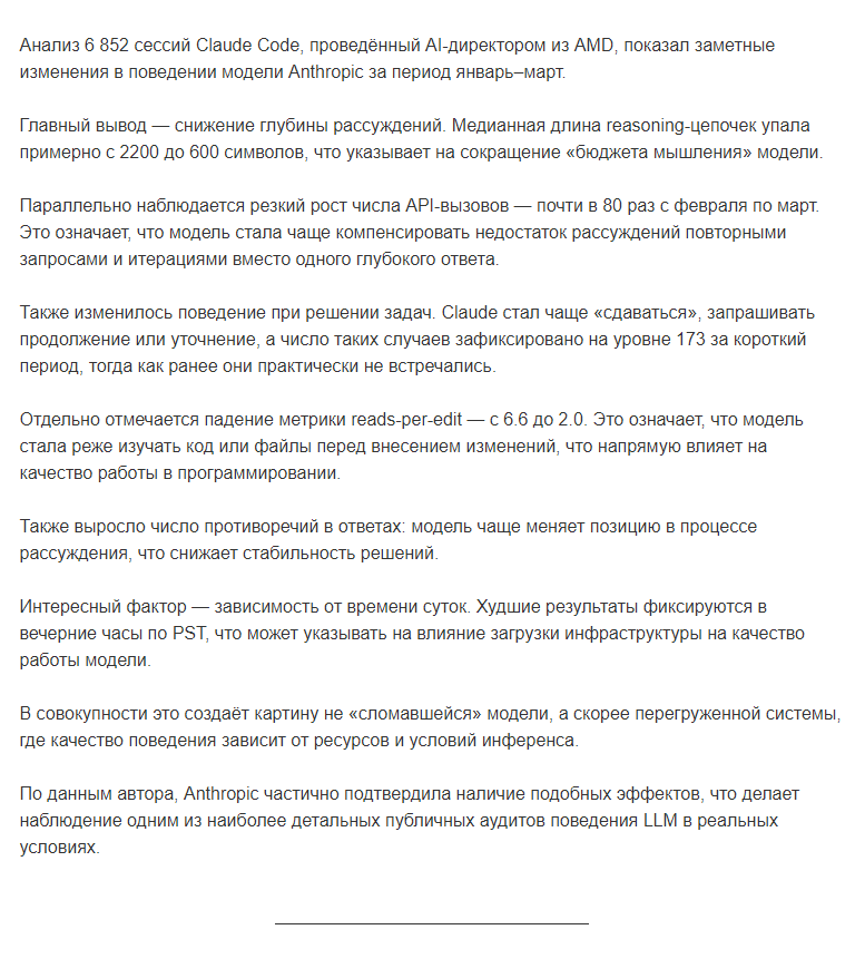 Если смотреть в корень, мы стали свидетелями классического конфликта «бизнес против интеллекта». Пытаясь оптимизировать задержки (latency) и снизить нагрузку на сервера перед релизом Opus 4.7, Anthropic пережала «гайки» в обвязке модели. Это важный урок для всех, кто строит бизнес-процессы на базе LLM: даже если веса самой нейросети не меняются, её поведение может деградировать из-за изменений в системных промптах или логике кэширования. На текущий момент все ошибки исправлены (начиная с версии v2.1.116), а пользователям сбросили лимиты в качестве компенсации. Если ваш Claude все еще кажется «вялым» — убедитесь, что в настройках (например, в Claude Code) принудительно выставлен параметр effort: high, чтобы пробить остаточные ограничения инфраструктуры.