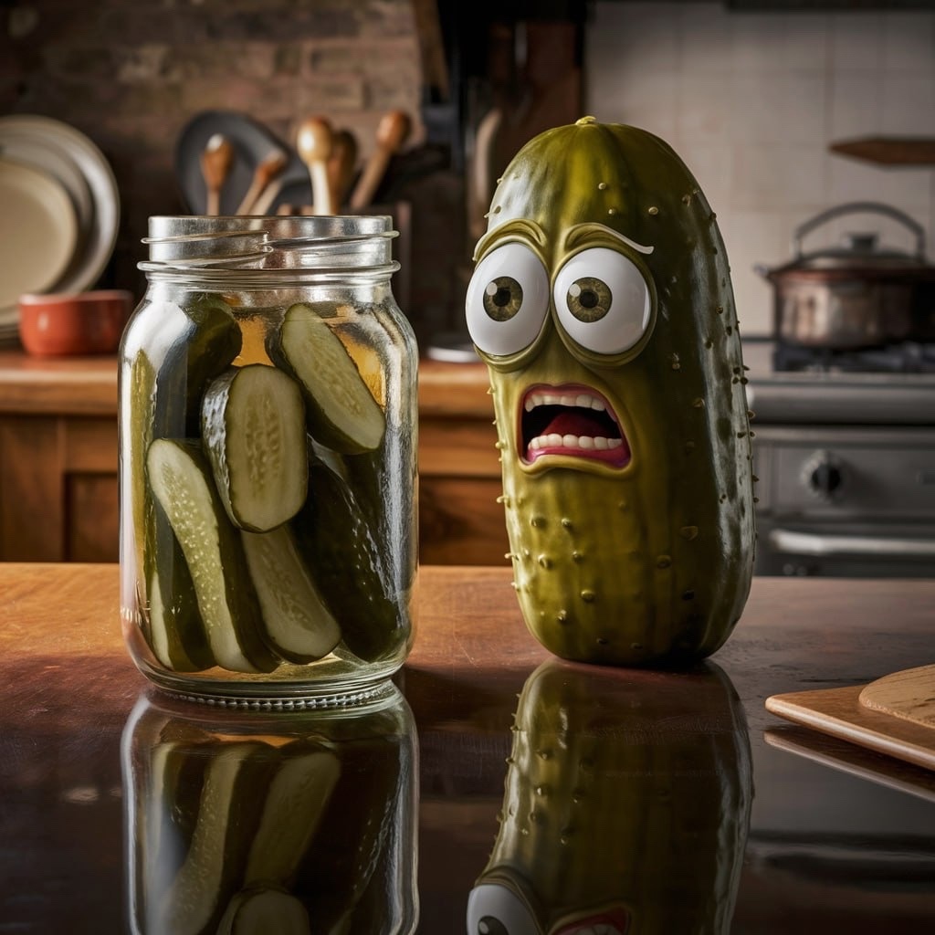 A hilarious, photo-realistic image of a pickle with oversized, wide-open cartoon googly eyes, staring in horror at a jar of chopped pickles. The pickle's exaggerated expression conveys shock and sadness, as if it's mourning its brethren. The rustic kitchen in the background has a wooden countertop, old-fashioned dishes, and a vintage stove, adding a charming atmosphere to the scene. The pickle's reflection in the jar's glass surface adds an interesting depth to the composition.