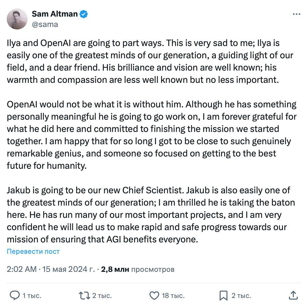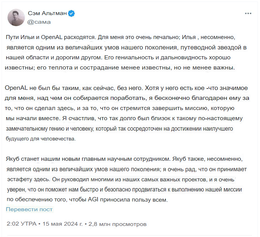 В офисе Open AI снова перестановки. Сооснователь Илья Суцкевер уходит, чтобы заняться своими проектами.
