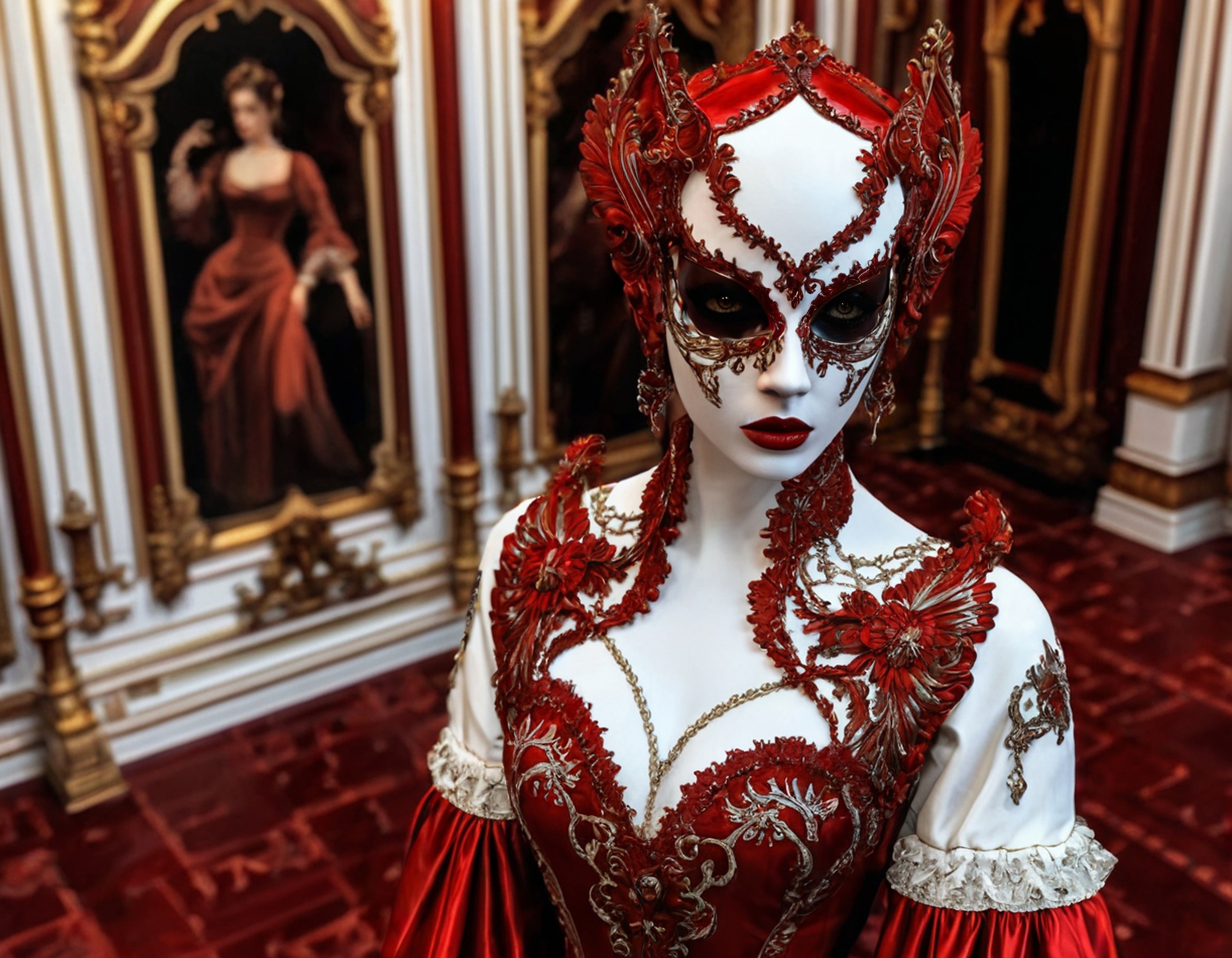 A surreal scene featuring a young woman,broken porcelain bloody scarry mask, bloody masquerade,horror,decripit desolated mech surface