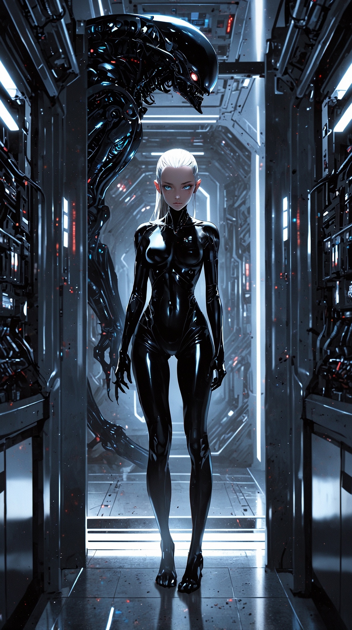 A tall, alien creature-a girl with smooth, shining silver skin-stands elegantly in the hallway of a technologically advanced spaceship. HER huge obsidian eyes look directly at the observer, immersing him in a world of wonders and mysteries. The intricate details of the alien's anatomy, from its elongated limbs to its graceful posture, are depicted with exceptional precision in what appears to be a mesmerizing high-definition digital painting. This irresistible image organically combines otherworldly charm and futuristic sophistication of a woman, mesmerizing the audience with its unsurpassed skill.