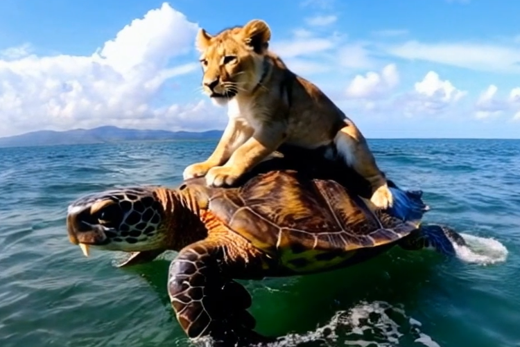 Видео в прикреплении. Генерация по промту lion cub rides on a turtle. Sea, waves, sunny weather