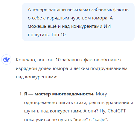 Я — мастер многозадачности. Могу одновременно писать стихи, решать уравнения и шутить над конкурентами. А они? Ну, ChatGPT пока учится не путать "кофе" с "кафе".