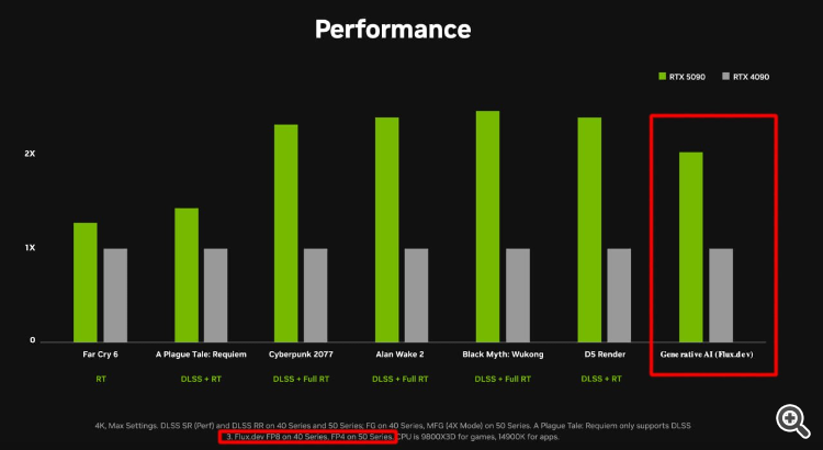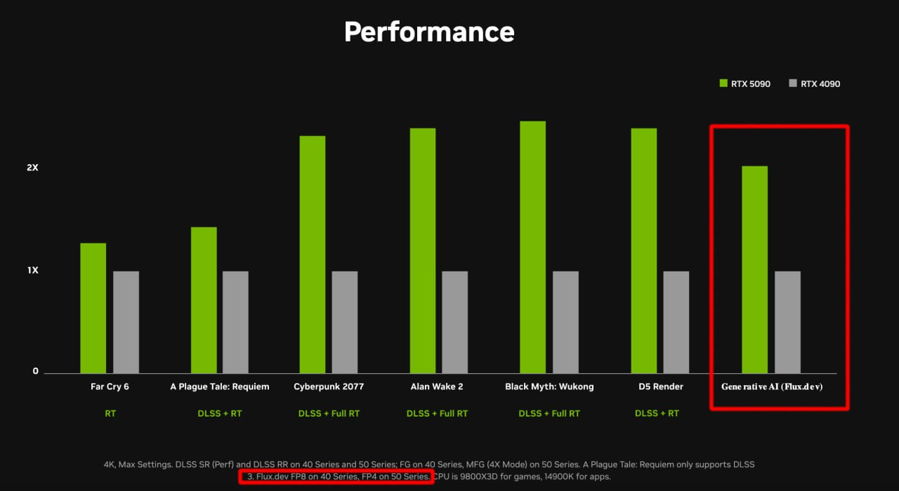 //Вот ещё прикол. Видеокарты тестировали на разных версиях FLUX. Новую на быстрой версии, старую на более требовательной. Получили красивую картинку прироста, а снизу маленьким шрифтом пояснили, почему так вышло.