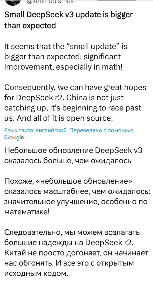 Обновлённый DeepSeek3 (0324) лидирует в мировых ИИ