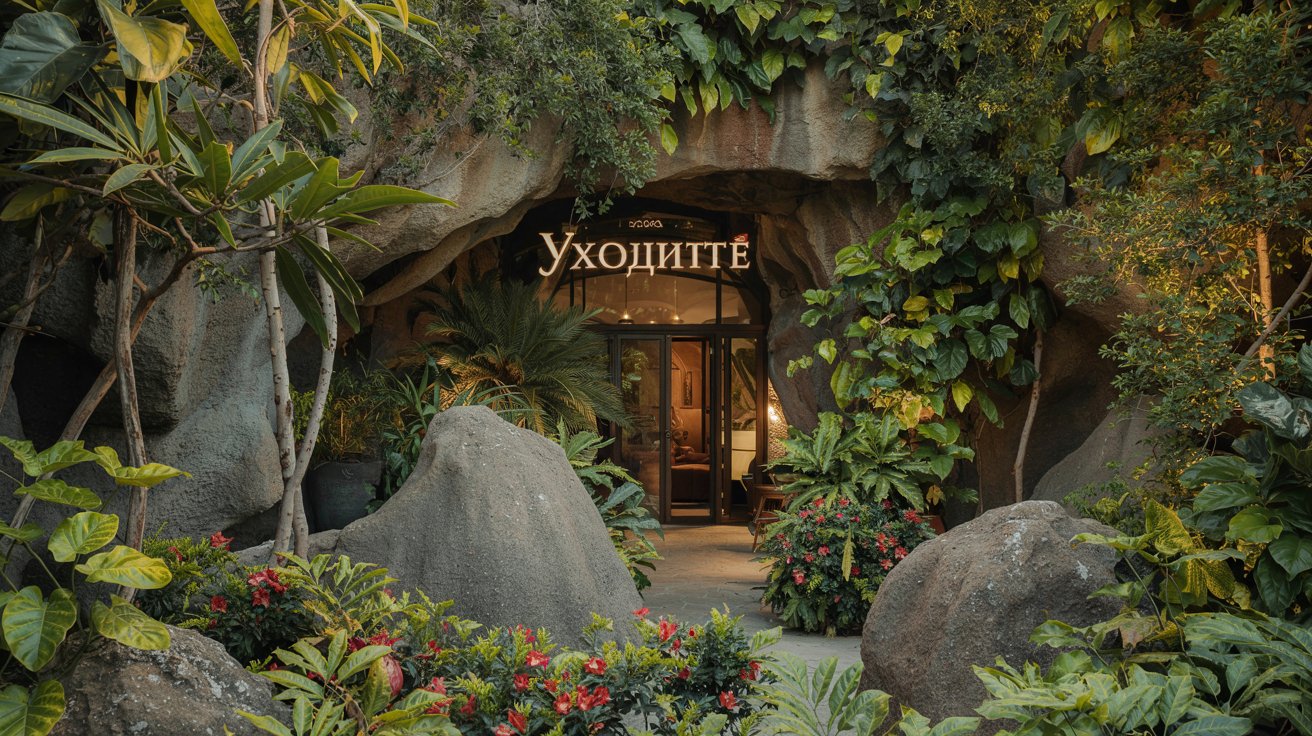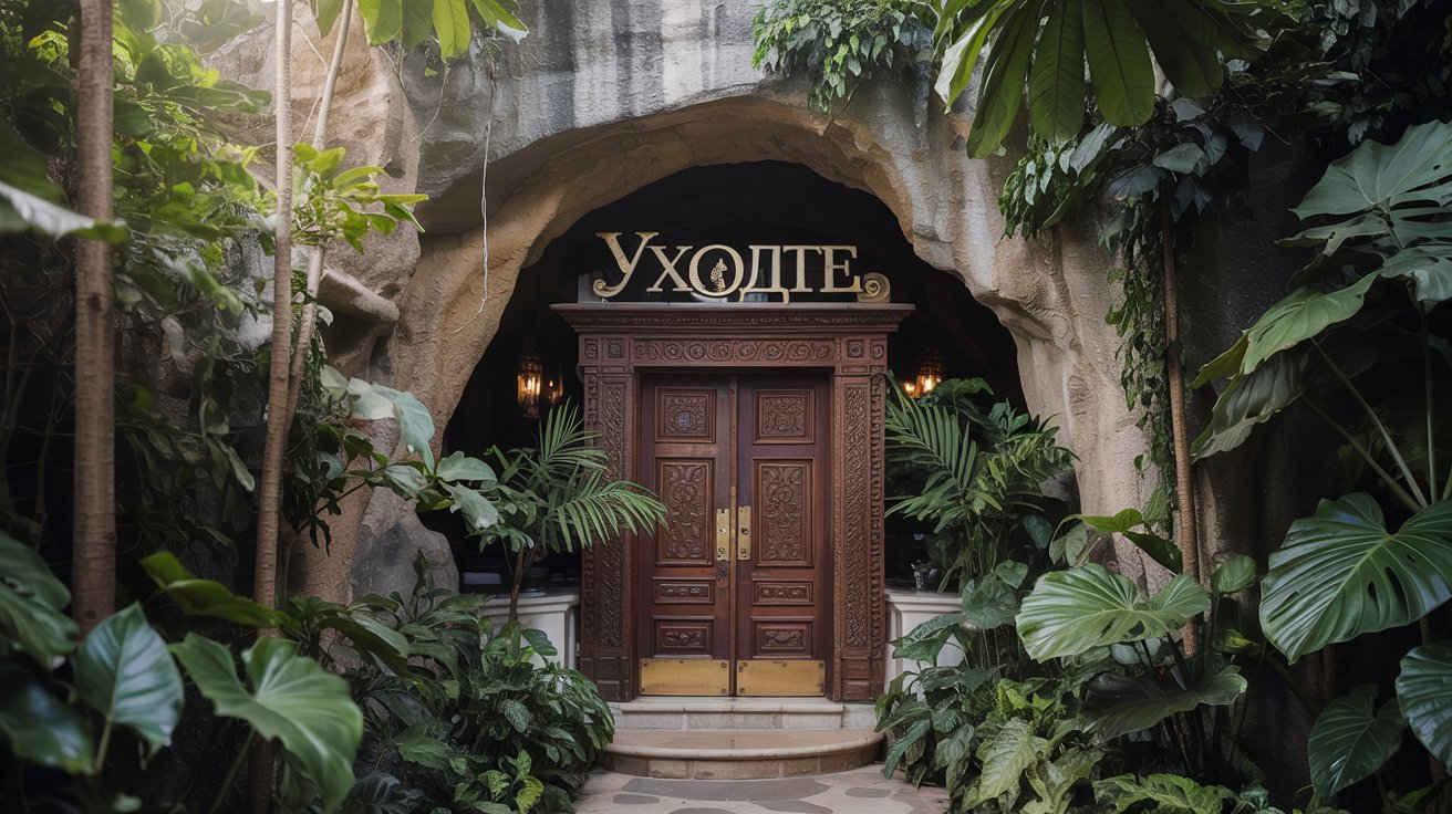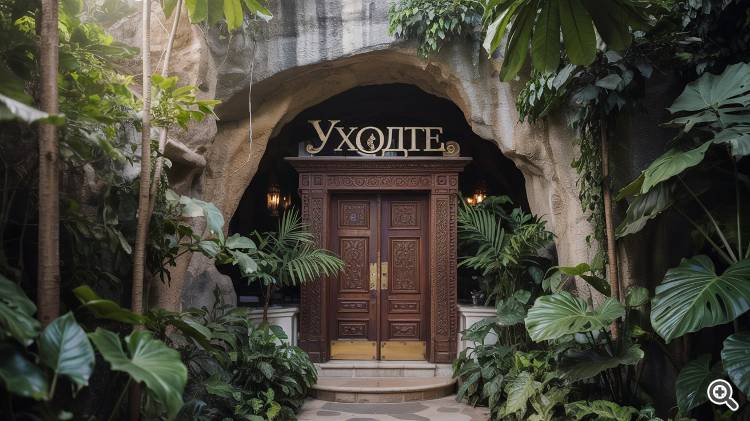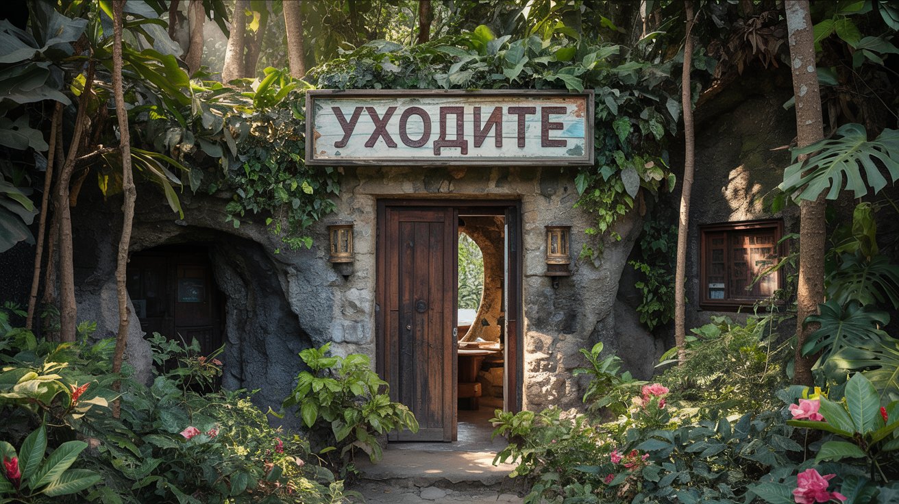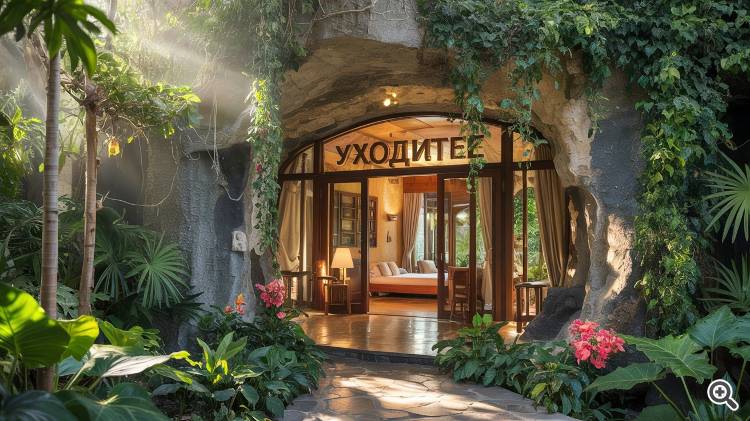 Промт пример: "гостиница в пещере посреди джунглей, надпись на двери "Уходите". Фотореалистично"