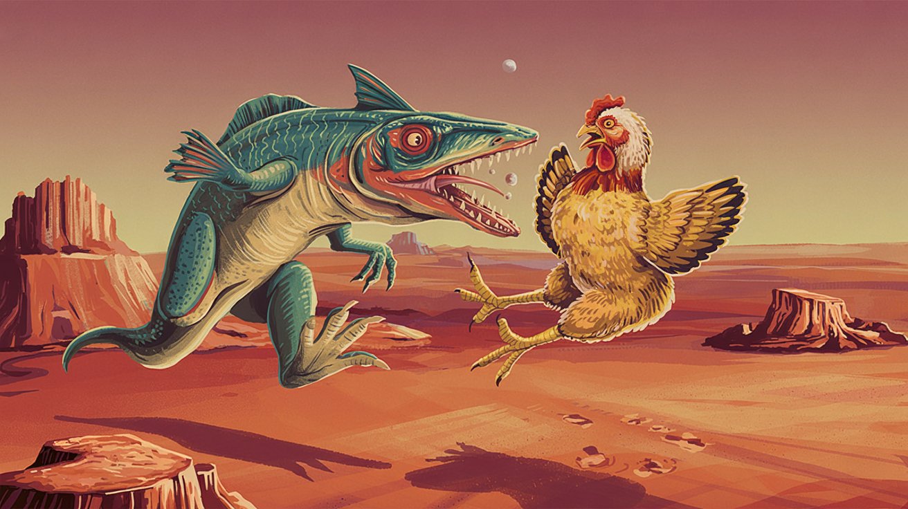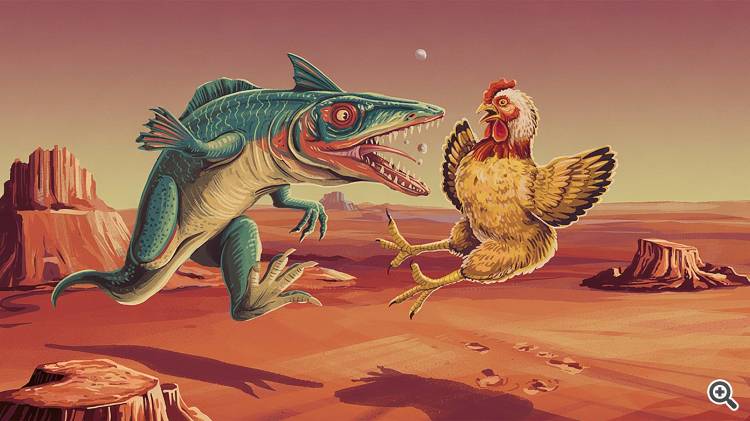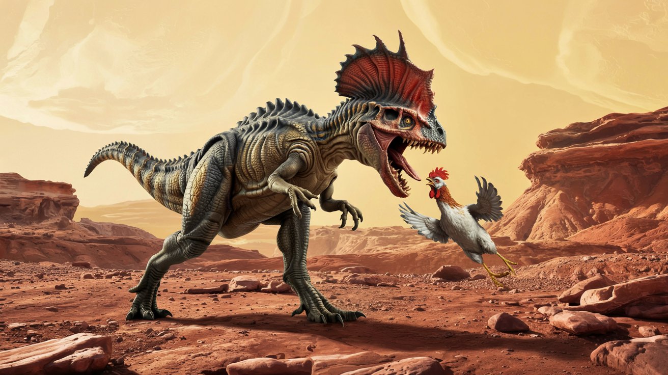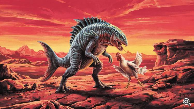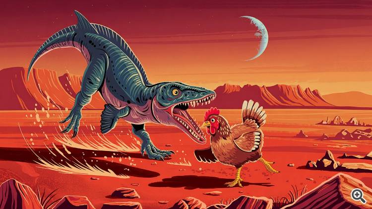 Мой пример "Рыбный динозавр атакует курицу на Марсе"