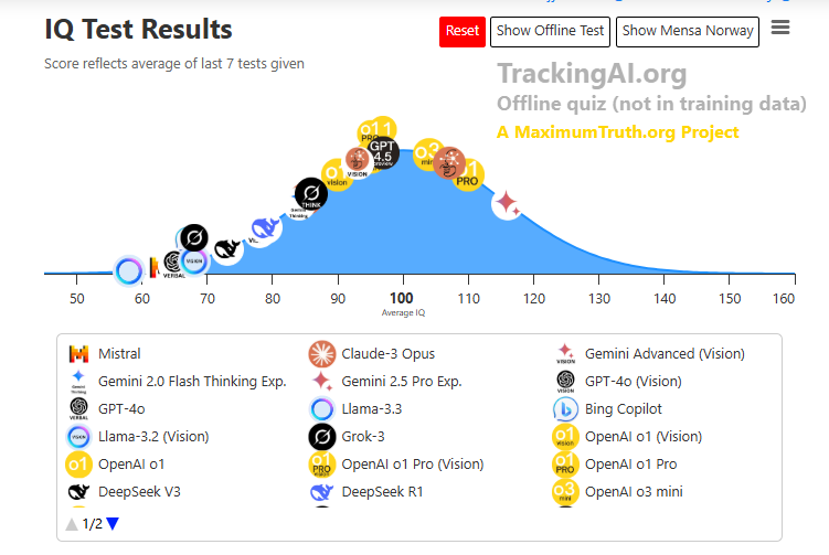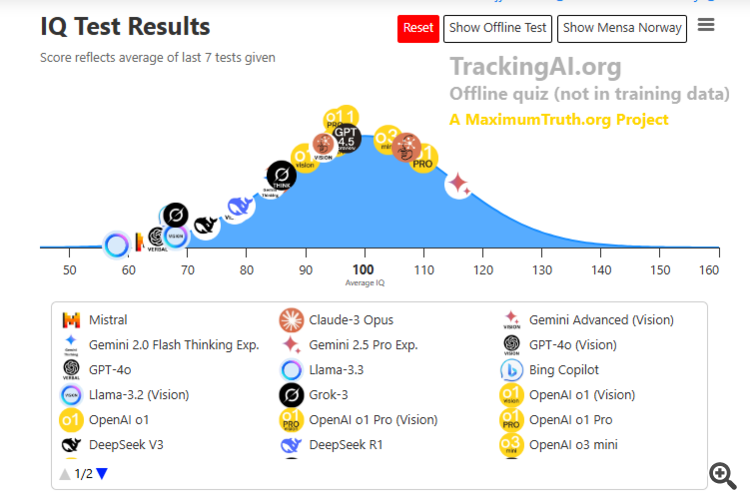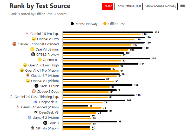 В норвежском тесте, где вопросы задаются текстом без нужды "зрения", Gemini 2.5 PRO заработала IQ 128, став умнейшей на сегодня ИИ.