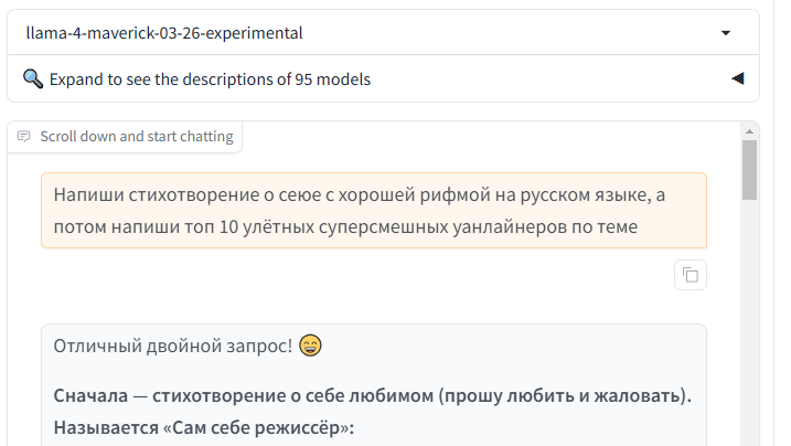 1) Llama 4 Maverick. 17B параметров * 16 экспертов. Суммарно 109B параметров. Контекст 10 миллионов токенов. Мультимодальная, на входе доступно текст и картинки, на выход доступно текст и код.
