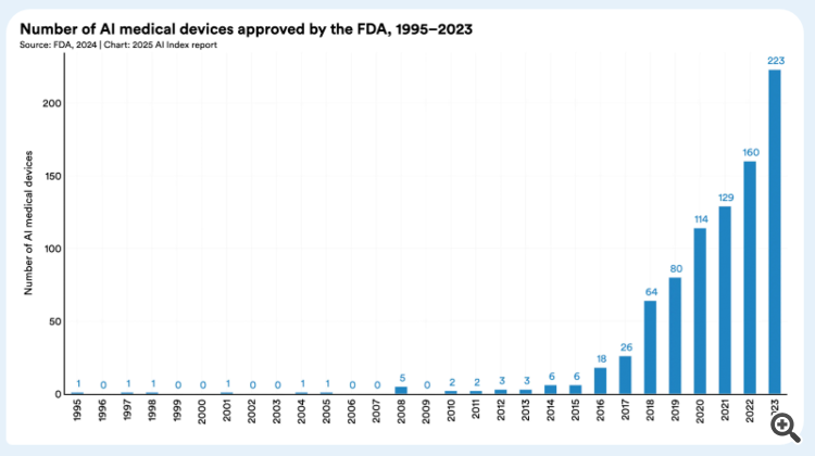 От здравоохранения до транспорта — искусственный интеллект быстро перемещается из лаборатории в повседневную жизнь. В 2023 году FDA одобрило 223 медицинских устройства с поддержкой искусственного интеллекта, по сравнению с шестью в 2015 году. На дорогах беспилотные автомобили больше не являются экспериментальными: Waymo, один из крупнейших операторов в США, обеспечивает более 150 000 автономных поездок каждую неделю, в то время как доступный парк роботакси Apollo Go от Baidu теперь обслуживает множество городов по всему Китаю.
