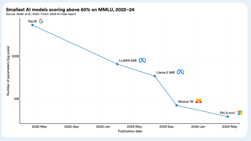 В период с ноября 2022 года по октябрь 2024 года стоимость вывода для системы, работающей на уровне GPT-3.5, снизилась более чем в 280 раз. На аппаратном уровне затраты снижаются на 30% в год, в то время как энергоэффективность улучшается на 40% каждый год. Модели с открытым весом также сокращают разрыв с закрытыми моделями, сокращая разницу в производительности с 8% до всего лишь 1,7% по некоторым показателям за один год. В совокупности эти тенденции быстро снижают барьеры на пути к продвинутому ИИ.
