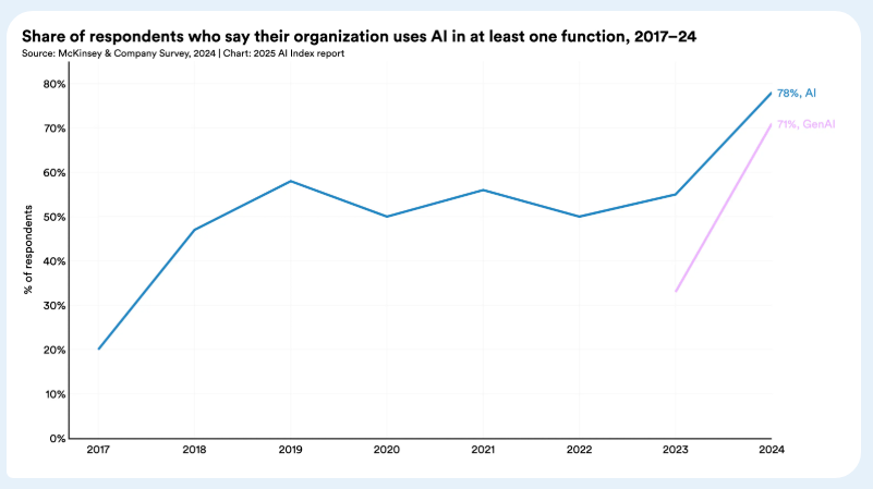 В 2024 году частные инвестиции в искусственный интеллект в США выросли до $109,1 млрд, что почти в 12 раз больше, чем в Китае ($9,3 млрд) и в 24 раза больше, чем в Великобритании ($4,5 млрд). Генеративный ИИ продемонстрировал особенно сильный импульс, привлек 33,9 млрд долларов США частных инвестиций по всему миру, что на 18,7% больше, чем в 2023 году. Использование ИИ в бизнесе также ускоряется: 78% организаций сообщили об использовании ИИ в 2024 году по сравнению с 55% годом ранее. Между тем, растущее количество исследований подтверждает, что ИИ повышает производительность и, в большинстве случаев, помогает сократить разрыв в навыках среди сотрудников.