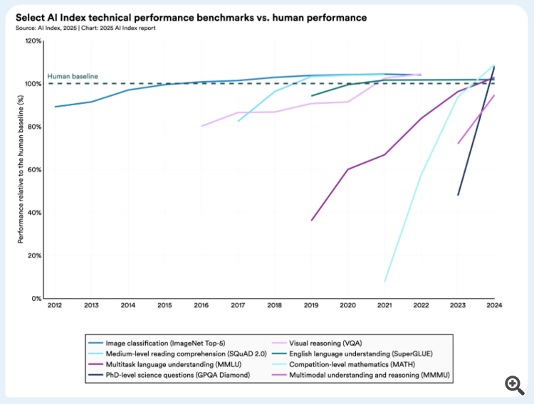 В 2023 году исследователи представили новые бенчмарки — MMMU, GPQA и SWE-bench — для проверки пределов продвинутых систем искусственного интеллекта. Уже через год производительность резко возросла: баллы выросли на 18,8, 48,9 и 67,3 процентных пункта по MMMU, GPQA и SWE-bench соответственно. Помимо тестов, системы искусственного интеллекта добились значительных успехов в создании высококачественного видео, а в некоторых условиях агенты языковой модели даже превосходили людей в задачах программирования с ограниченным временным бюджетом.