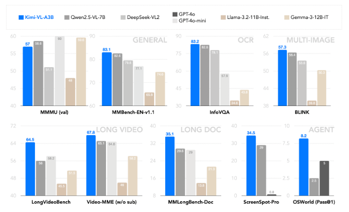 * Kimi-VL-A3B-Instruct: рекомендуется для эффективного логического вывода при общем многомодальном восприятии и понимании, OCR, длинных видео и длинных документах, восприятии видео и использовании агентов.