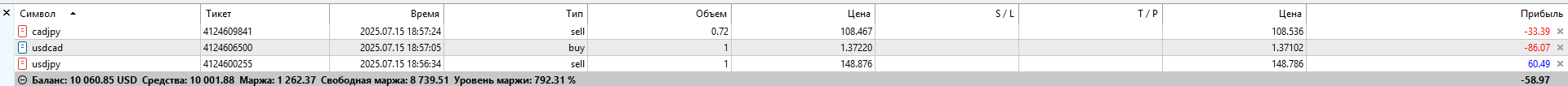 то есть в демке SELL 1 USDJPY, BUY 1 USDCAD или кроссом SELL 0.72 (~1/USDCAD) CADJPY (ничего вроде впопыхах не перепутал с объёмом)
