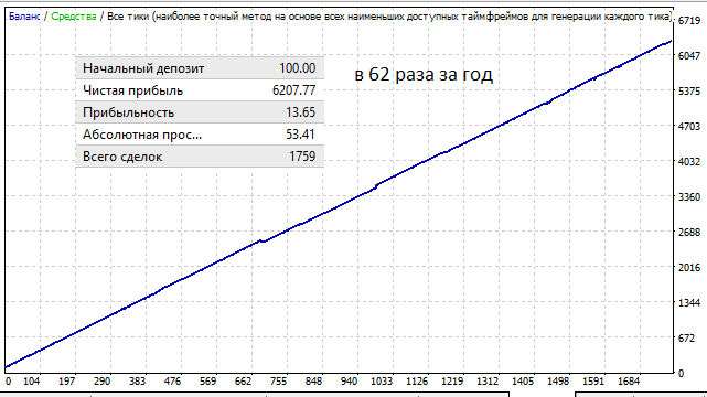 Если лот постоянный - баланс будет расти линейно. Надо лот делать пропорциональным - будет экспонента и прибыль много больше