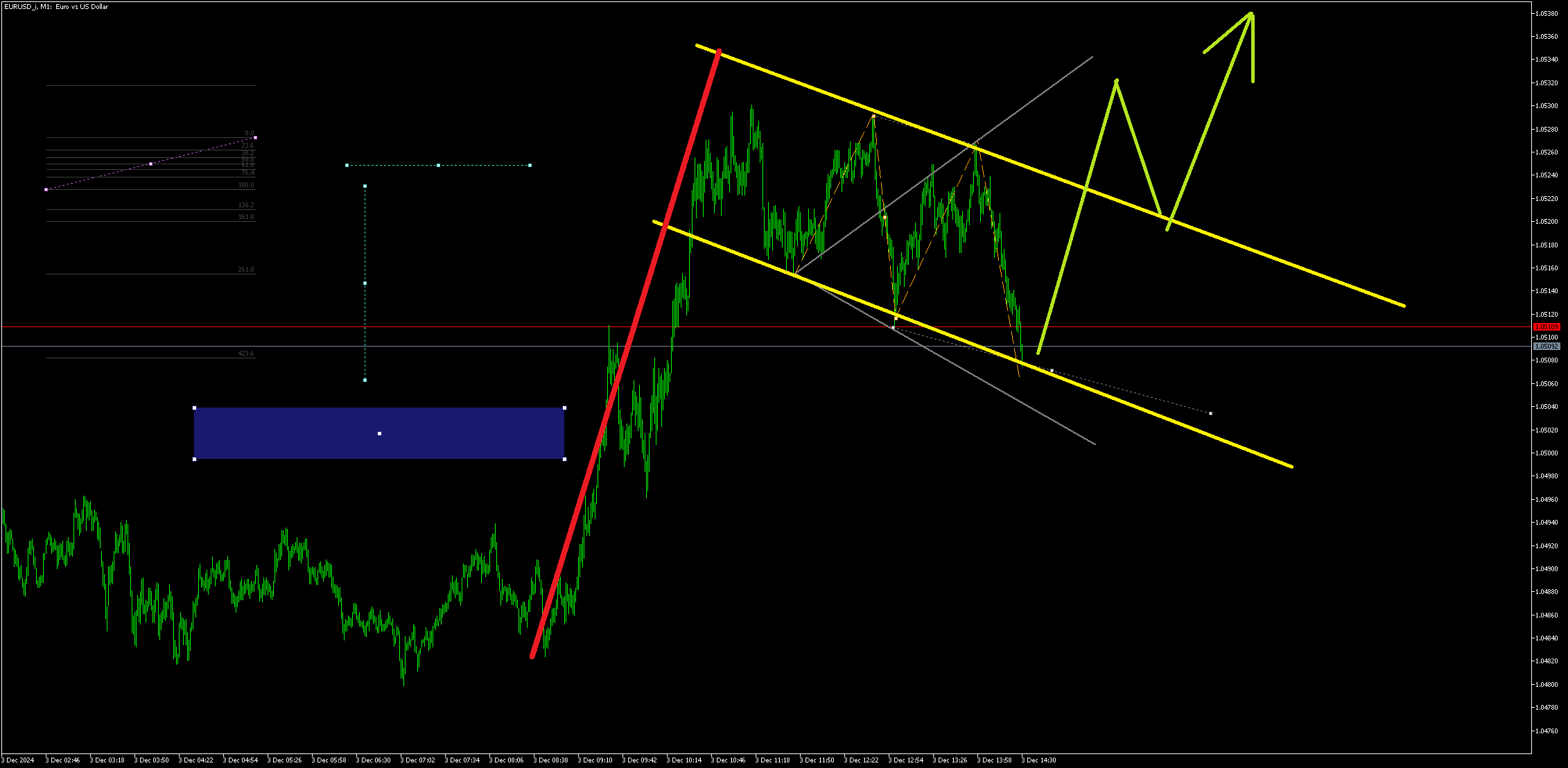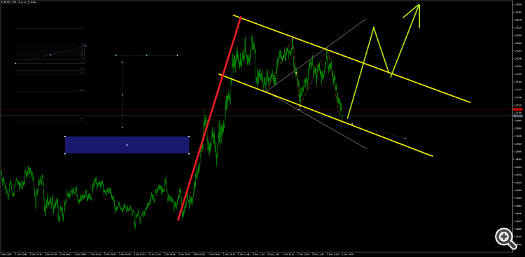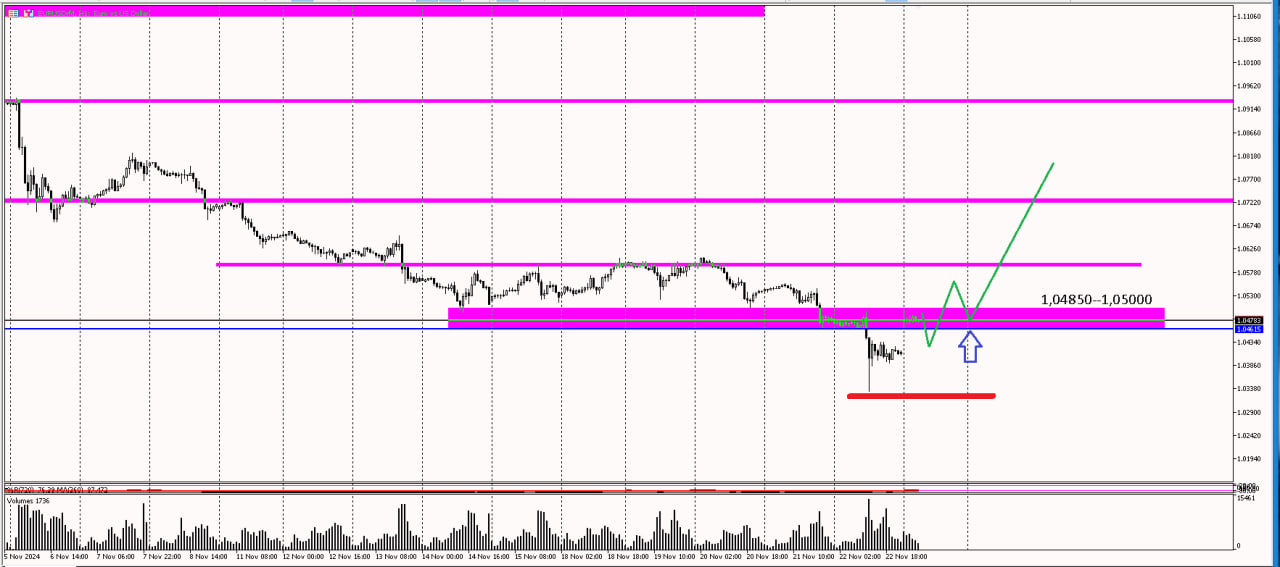 И, судя по наличию формирующейся волны Вульфа, есть вероятность, что спорная волна — это лиши коррекция к синему тренду и сейчас пойдёт волная вверх до 1.06000