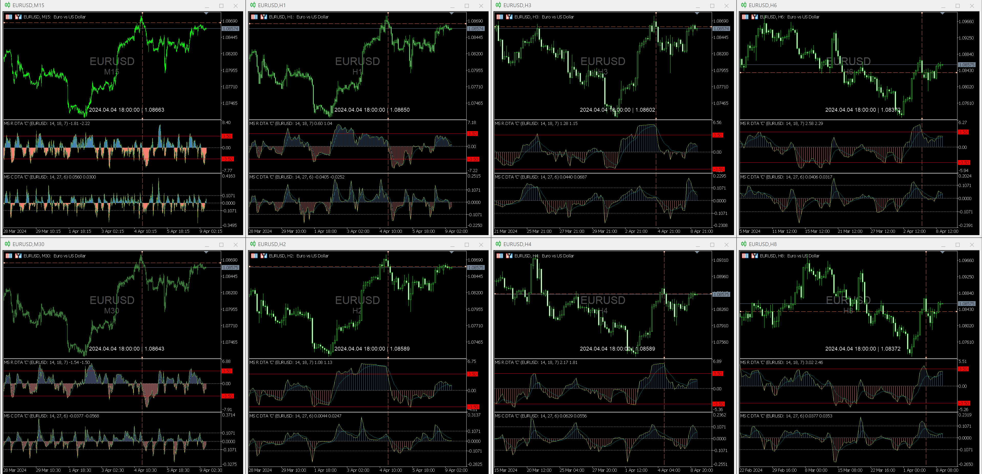 Не подходит, поскольку ожидается, что индикатор будет реагировать на небольшие изменения цены. А объединение всех таймфреймов в один график создает хаос. Но ничто не мешает создать мозаику из разных таймфреймов.