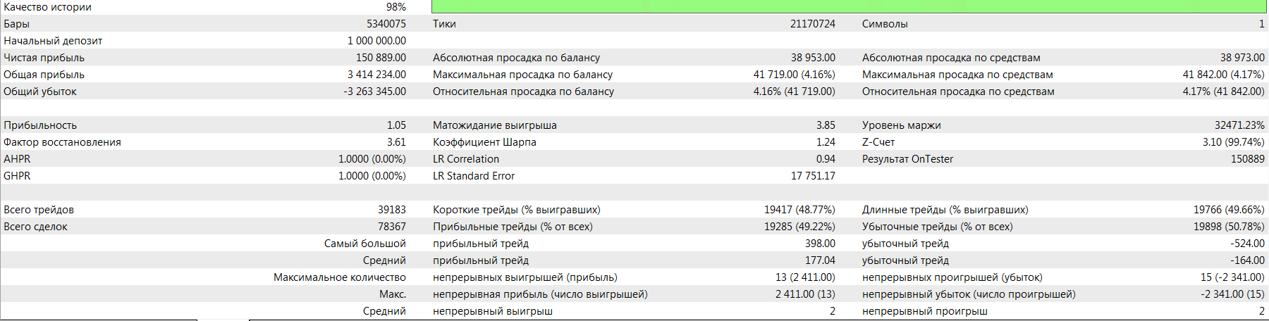 В целом маленькое мат. ожидание, но большая прибыль на первой рандомной выборке. Плюс - много сделок, есть чего фильтровать.