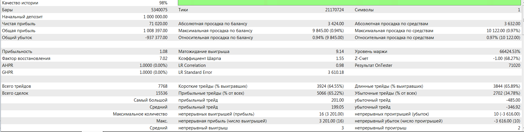 Можно было предположить, что поймает уж эта стратегия небольшой перекос в сторону тренда на верхних ТФ, но нет.