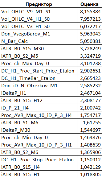 Ниже на рисунке предикторы в топе для распознания реальных данных с чарта EURUSD на выборке exam одной из моделей