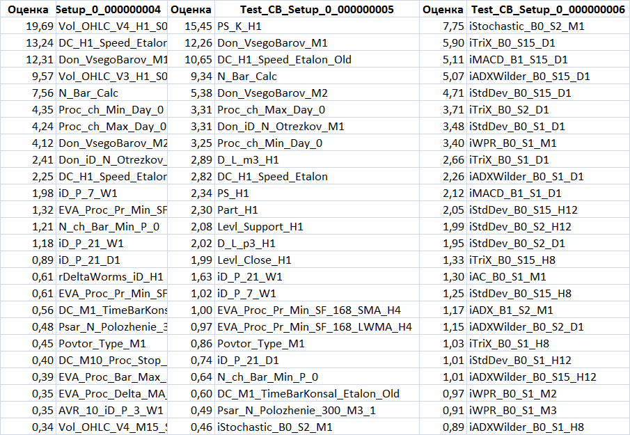По поводу Setup 4 и 5 (так же как и 2 и 3), можно отметить, что предикторов остаётся ещё достаточно, что бы показывать высокий результат. Глубокого разбора их я делать не буду тут, а лишь отмечу, что значимым оказался Povtor_Type_M1, в котором происходит подсчёт числа повторений баров одного типа (растущий и падающий), и одна из стратегий ранее была построена на этом принципе - что-то есть уникальное в последовательности баров.