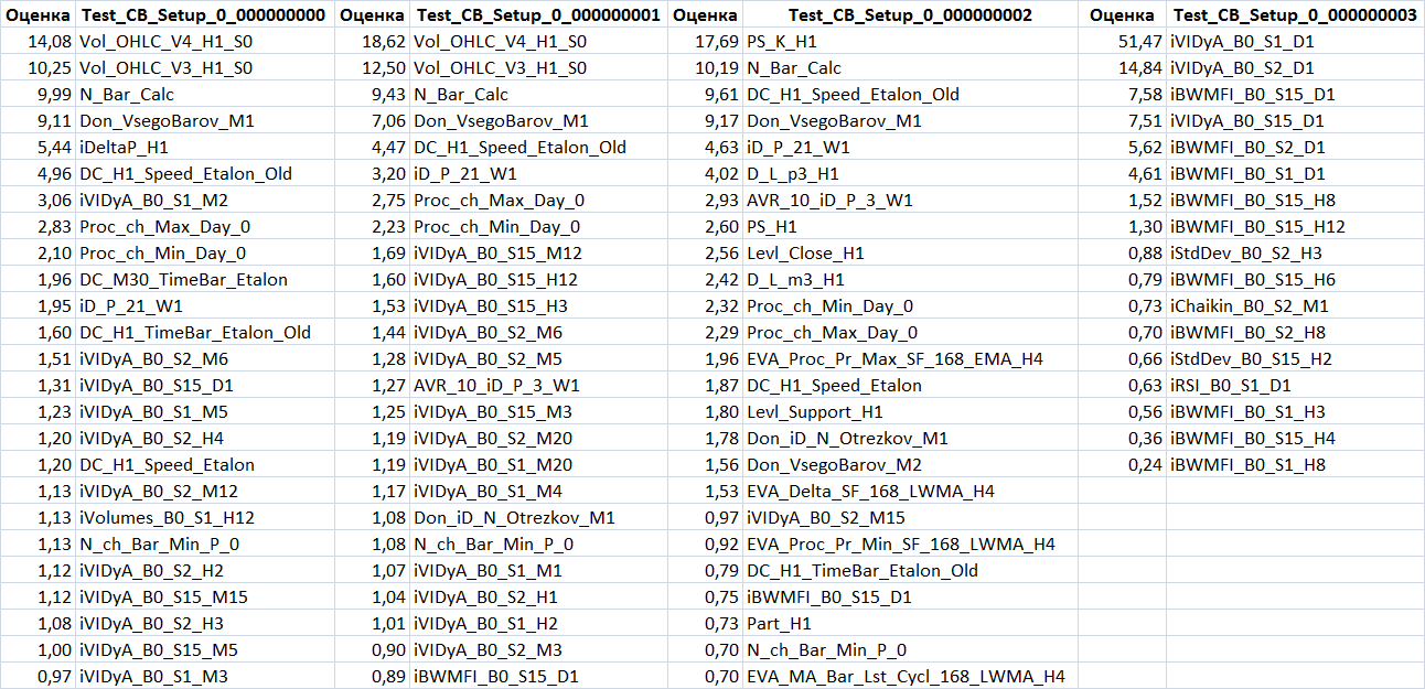 Смотря на последний столбец, где обучались по осцилляторам, я решил получше изучить эти индикаторы, как они там считаются, и оказалось, что iVIDyA вовсе не осциллятор, а индикатор типа скользящего среднего, который фактически записывал цены в выборку, что могло способствовать детекции свой-чужой. А так же оказалось, что iBWMFI и iChaikin используют объёмы, что так же может способствовать детекции двух разных чартов. В общем, решил исключить я эти три типа индикатора, убрав предикторы на их основе и обучиться опять:
