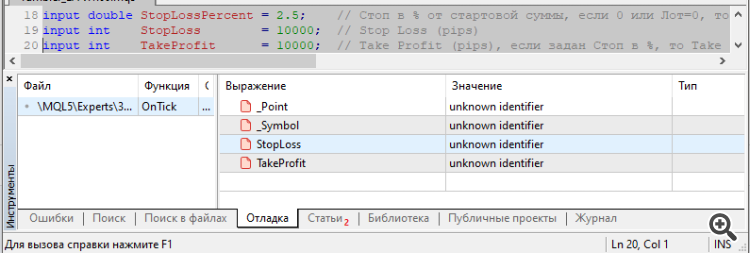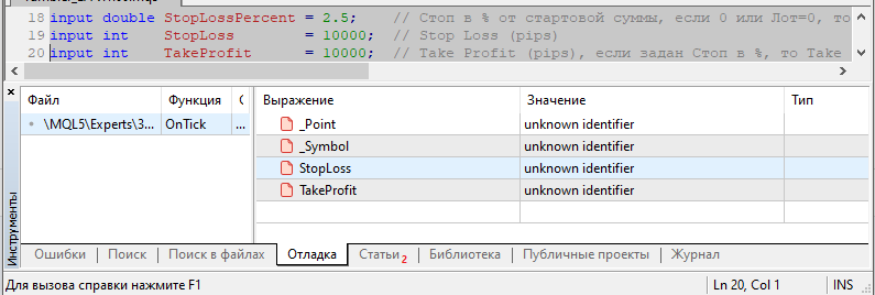 При отладке, почему то не показывает значения предопределённых переменных и input переменных.