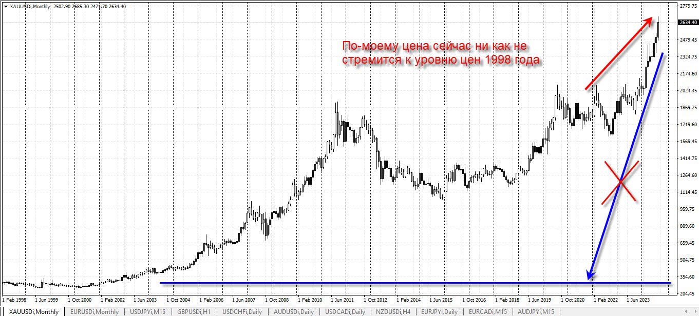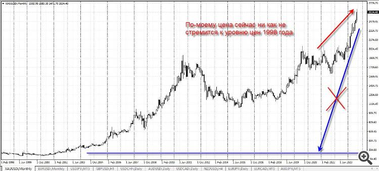 Если бы текущая цена всегда стремилась к цене открытия, то мы получили бы длиннючий горизонтальный коридор, и при этом тело свеч стремилось бы к доджам. Тренд ап и тренд даун отсутствовали бы вне теней свечи. То есть мы имели бы только микротренды. Однако, откроем месячный график того же Золота. Ответьте мне на вопрос, цена на золото сейчас стремится к ценам на золото, которые были в 1998 году?