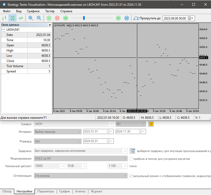 Запускаю в тестере одиночный проход второй советник на OHLC таймфрейм М1 с той же даты и на том же символе, что и первый.