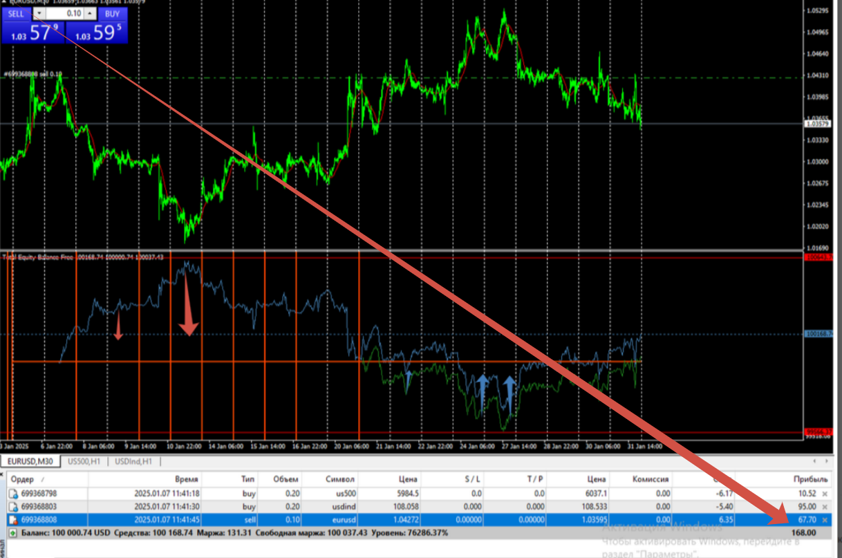 На истории и я вам могу точек входа показать кучу...на этом счете индик эквити рисует эквити через открытые позиции, поэтому входа на другом счете - торгуется график спреда - трехножного